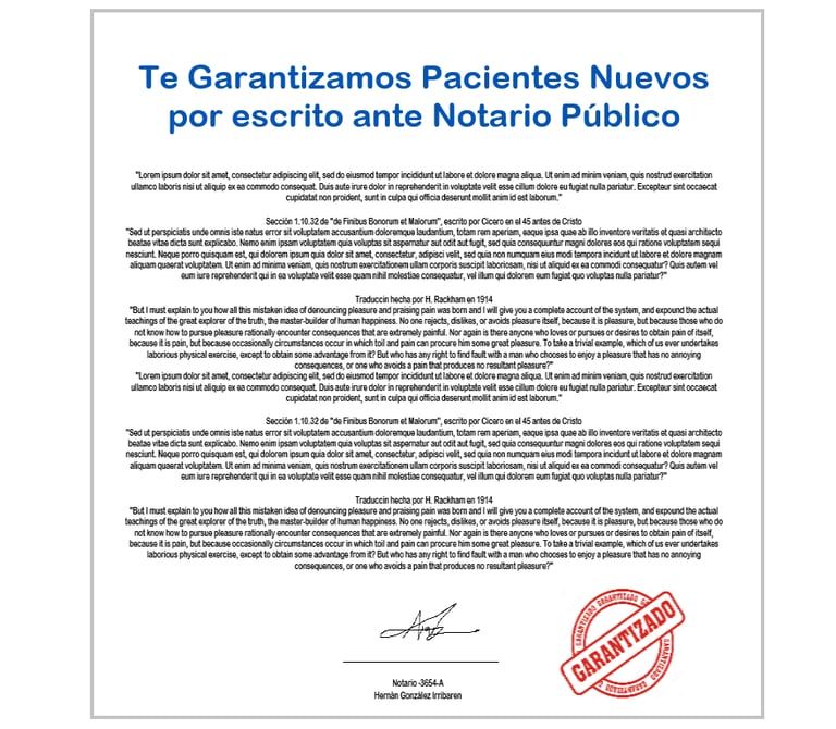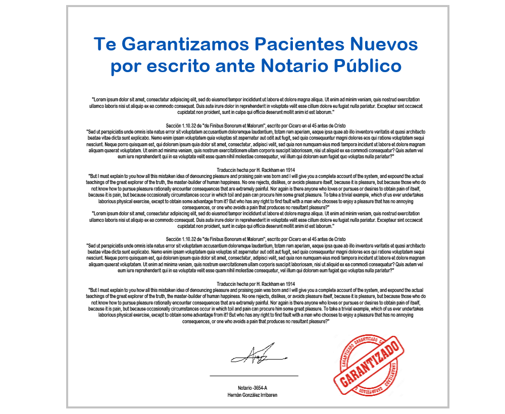 Estamos tan seguros de que te conseguimos pacientes nuevos con nuestro sistema, que lo ponemos por escrito, firmado ante notario público.